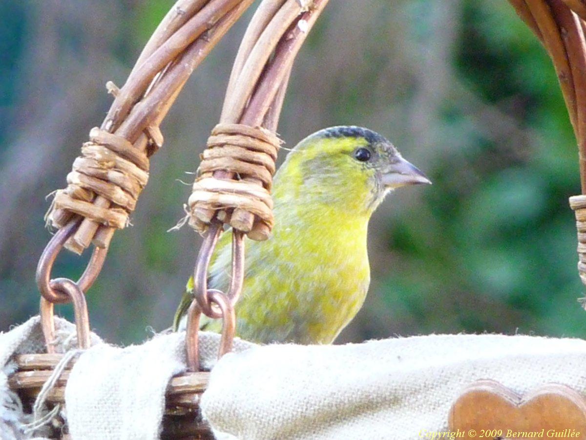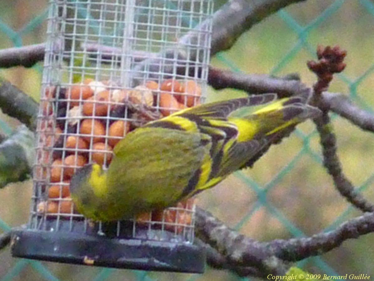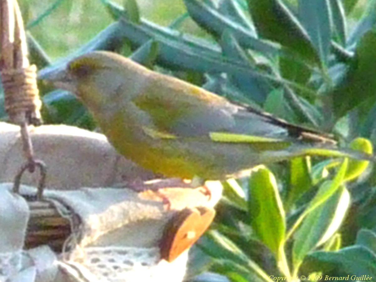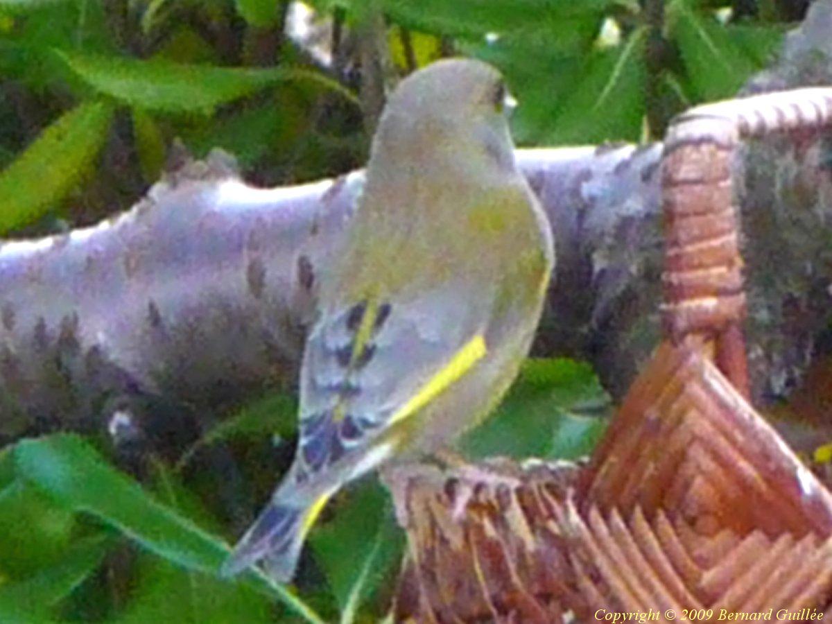 Famille des Fringillidés. C'est un pinson vert-jaune, de la taille d'un moineau (15 cm), avec le bec épais d'un granivore, et un caractère plutôt querelleur... Il se nourrit de graines, bourgeons, fleurs, et insectes. De couleur vert-olive, la bordure externe de ses ailes est d'un beau jaune vif.Cliquez sur l'une des miniatures ci-dessus pour l'agrandir