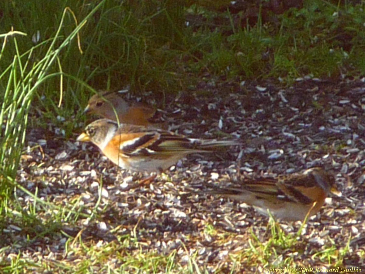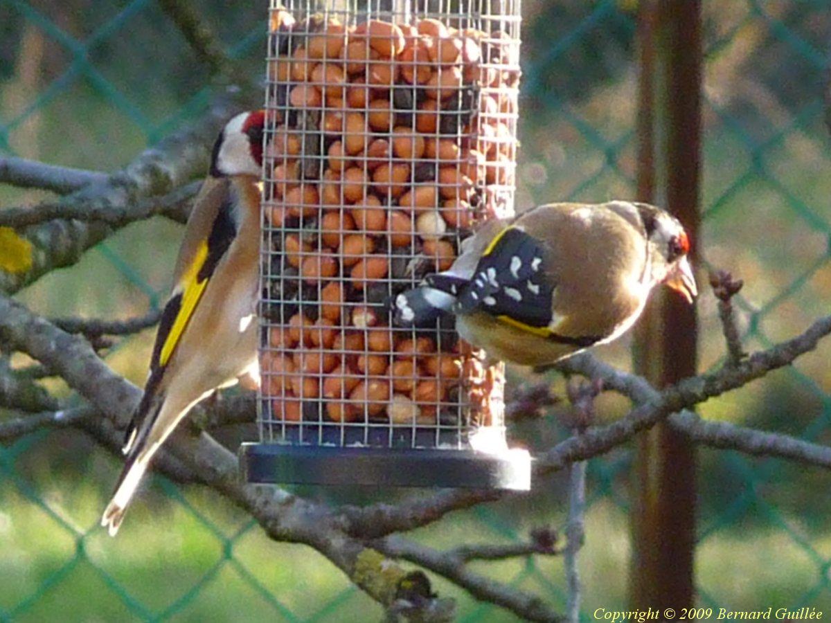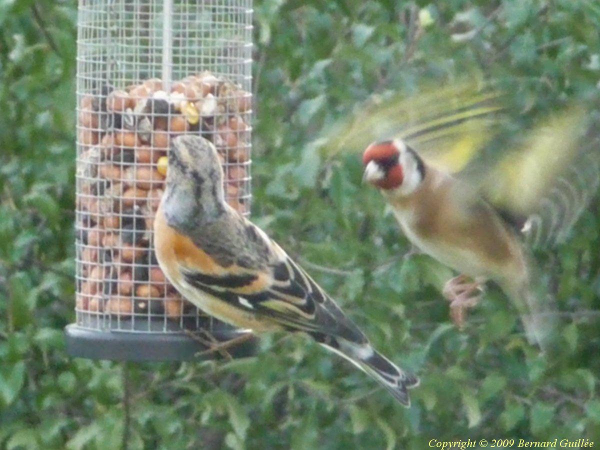prise en pleine action : Un chardonneret revient (de force) sur la mangeoire dont l'a délogé un pinson du nord quelques instants auparavant ! (Le pinson laissera sa place -provisoirement- !)
