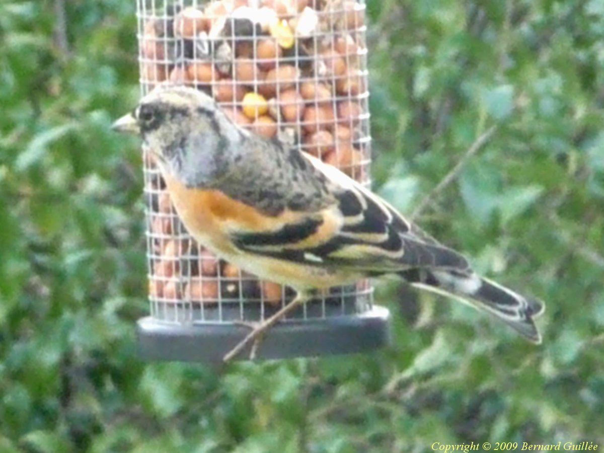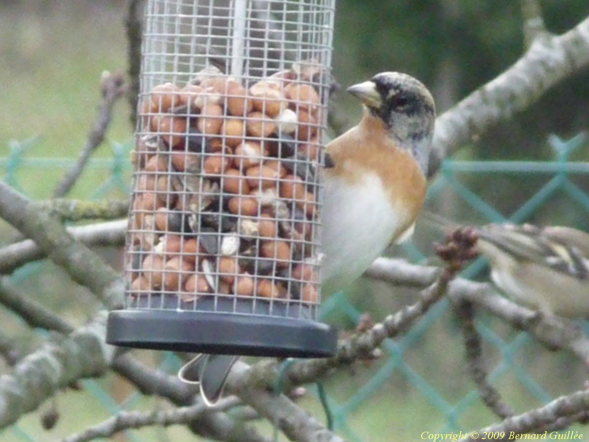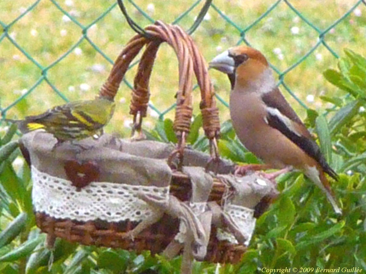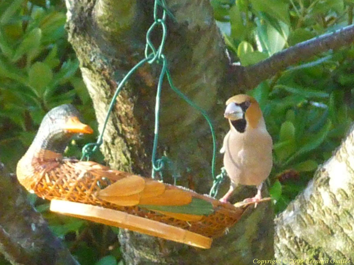 ou "Coccothraustes coccauthraustes" , 18cm de long, famille des fringillidés (pinsons) mais plus gros et plus trappu que les chardonnerets, très sociable sur les paniers de graines avec les pinsons plus petits, il a un très gros bec, de belles couleurs, et une queue courte... tête et ventre de couleurs orangé et beige, les yeux et le cou masqués de noir, il a une bande alaire et la queue blanches... visible tout l'hiver sur les mangeoires à graines, seul ou par couple, il se nourrit, les autres saisons, de fruits, de noyaux (d'où son nom) , et d'insectes :