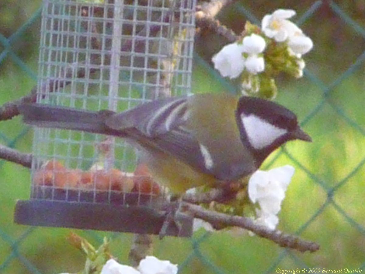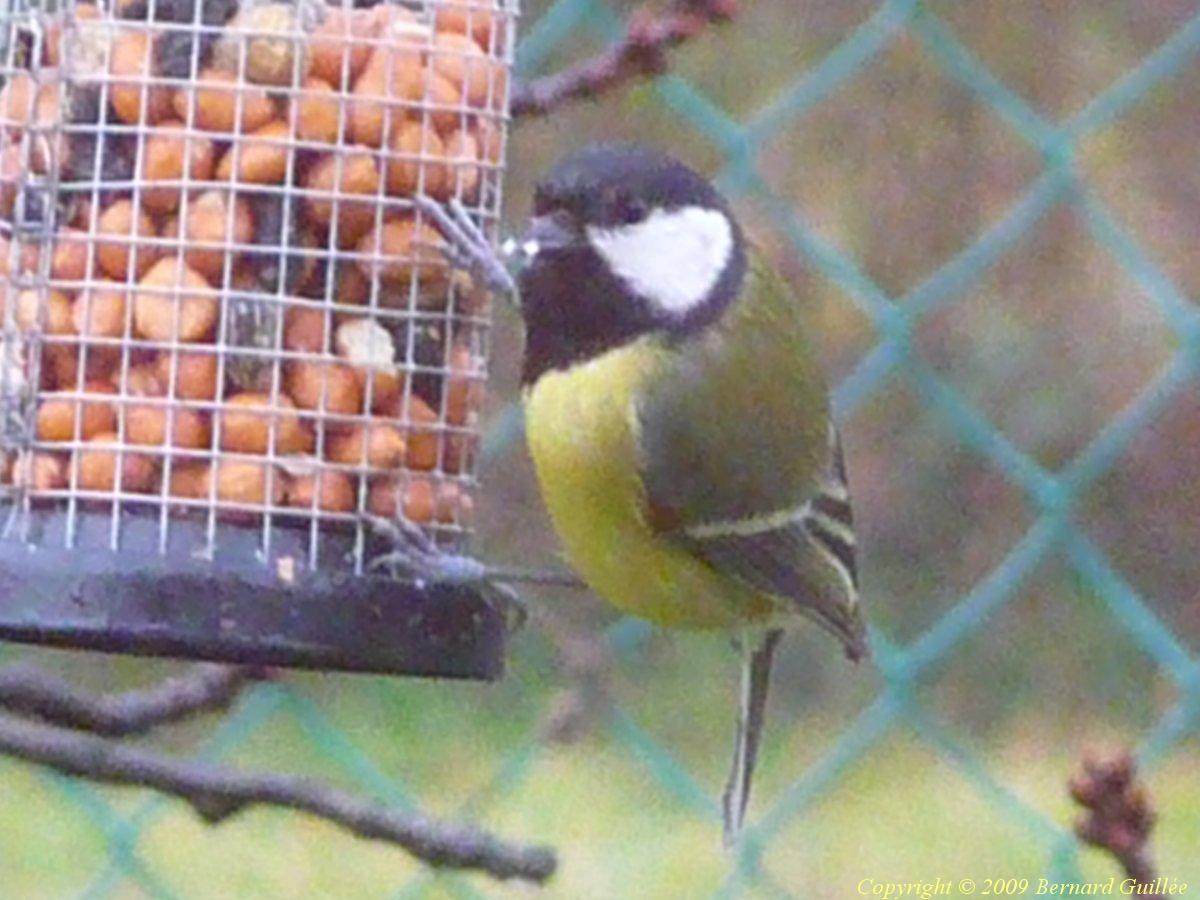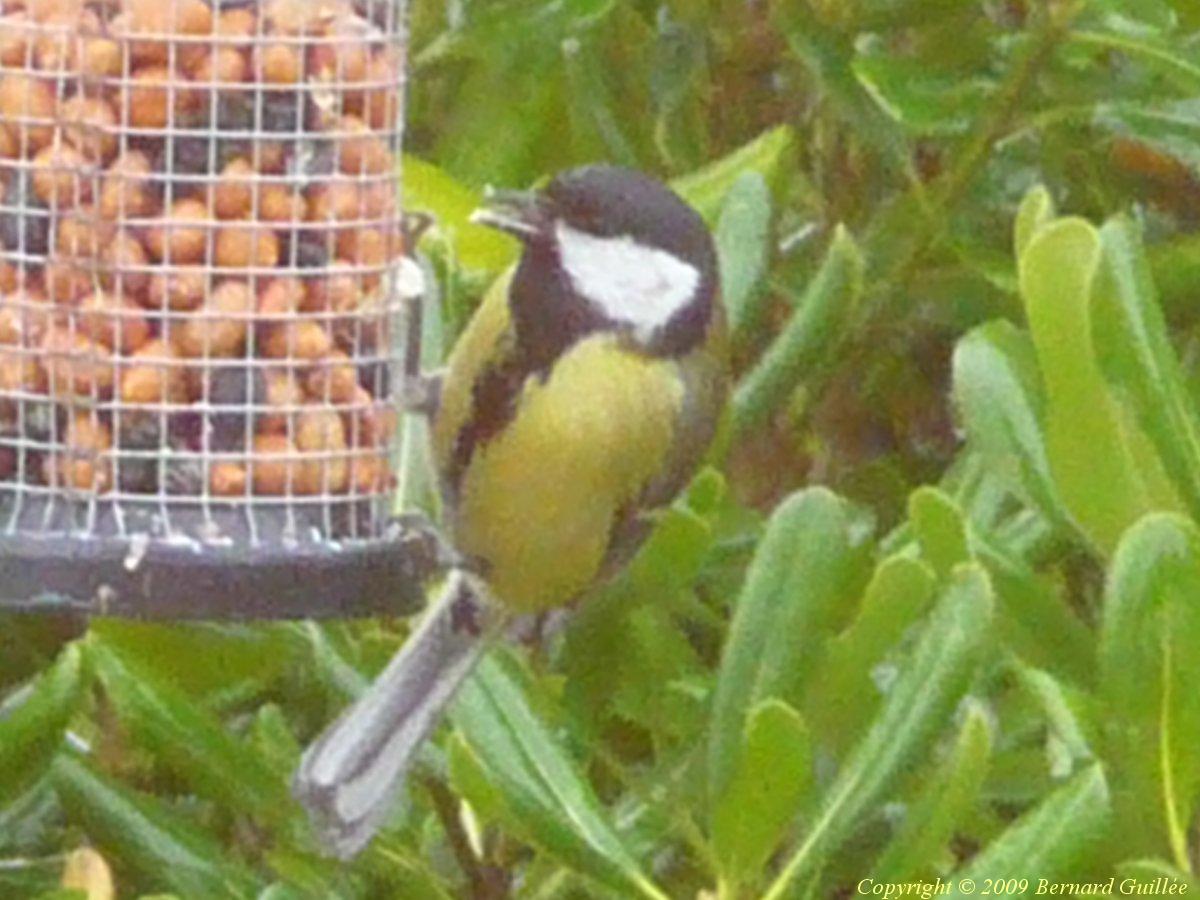 Petit passereau de la famille des Paridés, d'une taille de 14 cm de long et d'un poids de 15 à 20 g, la mésange charbonnière a la tête noire, les joues blanches, le ventre jaune, avec une cravate noire plus ou moins épaisse ( épaisse = mâle, fine = femelle) et le dos vert-olive, les ailes et la queue bleu-gris foncé. Elle se rencontre assez couramment dans les parcs et jardins, quoique moins fréquente que la mésange bleue. Elle fréquente volontiers les mangeoires de graines de tournesol et d'arachides dont elle est friande l'hiver (sa nourriture des autres saisons = insectes, chenilles, et escargots).