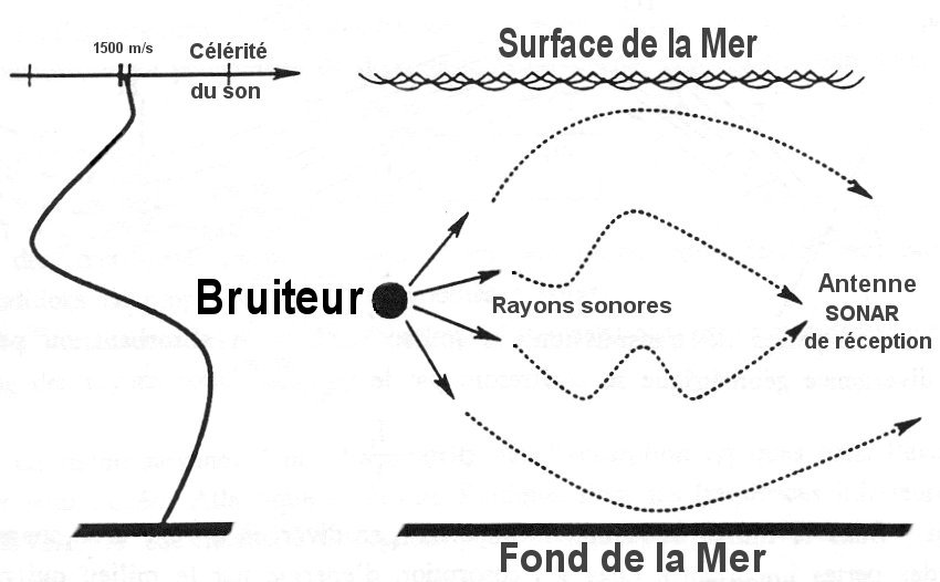 Rayons et Profils de célérité du son : comme déjà décrit dans la page précédente d' initiation à l' ASM , les rayons sonores émis par un SONAR actif (ou une cible bruyante) se propagent dans l'eau de mer en s' incurvant (dans le plan vertical principalement) vers le haut ou vers le bas, selon l'influence des variations de célérité du son dans l'eau. Il est assez rare qu' il se propage en ligne droite (mais cela arrive parfois, surtout en "petits fonds isothermes", comme par exemple en Mer de Chine du Sud, ou en Manche selon la saison -influence de l'atmosphère oblige-), et les divergences que l'on peut observer dans certains cas créent des zones d'ombre, où cibles et chasseurs se cachent provisoirement.